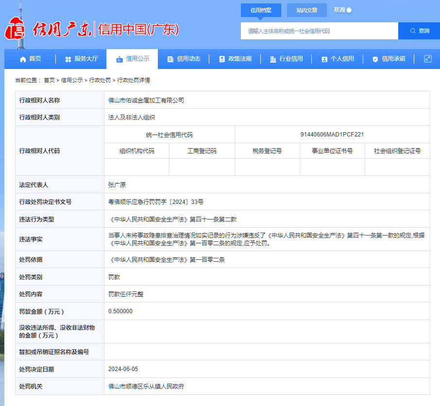 2024年6月5日消息,佛山市佑诚金属加工有限公司因未将事故隐患排查治理情况如实记录的行为,被佛山市顺德区乐从镇人民政府罚款5000元整。