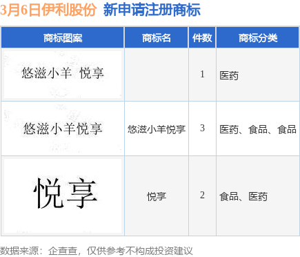 证券之星消息,根据企查查数据显示,近日内蒙古伊利实业集团股份有限公司新提交“悠滋小羊悦享”、“悦享”等6件商标注册申请。商标申请详情如下: