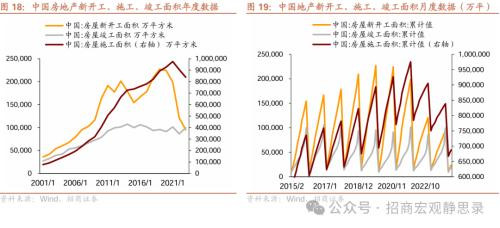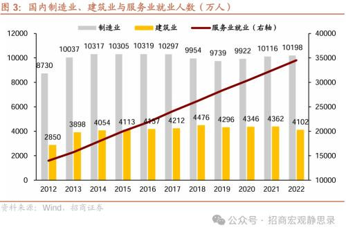 前文第二章中提到的制造业就业与建筑业就业之间的“跷跷板”关系,实则房地产和外需存在“跷跷板”关系。在明年外需转弱的背景下,地产投资回升就成为稳就业的关键,这也是近期房地产政策密集出台的原因。如图3所示,2020-2022年制造业新增458万就业岗位,而建筑业在2019-2022年减少了374万个岗位。整体而言,建筑业与制造业之间的就业人数变动呈现出一种平衡状态,即建筑业减少的就业人数与制造业增加的就业人数基本相当。
