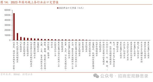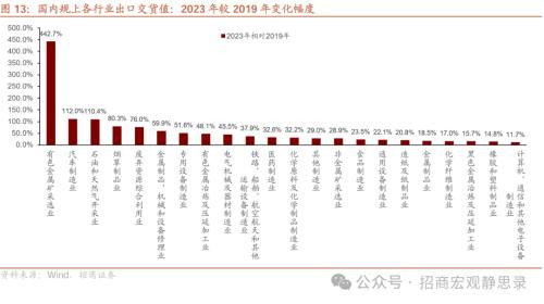 2023年和2019年相比,规上各行业出口交货值均有明显增长(图13),然而,由于内需市场的相对偏弱,以及自动化程度提升使得单位就业人口的产出增加,进而出口交货值的增长并未能对就业的产生同等程度的拉动效应。若明年出口明显转差,那么制造业特别是当前的出口受益行业对我国就业的贡献将会逐渐减弱甚至反转。