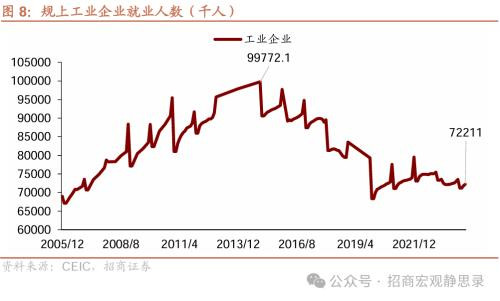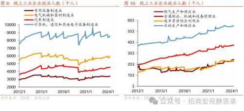 过去四年,出口链是稳就业的主要抓手。1)制造业就业和建筑业就业呈“跷跷板”关系。中低收入群体的主要就业领域为服务业/制造业/建筑业。其中,服务业就业人数稳步持续上升,而2018年以来制造业和建筑业的就业人数则呈“跷跷板”关系。建筑业就业在2018年见顶回落;制造业就业则在2019年见底回升。这种互补性折射的是此间国内房地产投资转弱但出口强劲增长。也可以理解为,外需对制造业的拉动有效对冲了地产投资转弱对就业的掣肘。2)2020年以来就业人数增加的制造业行业均为外需受益行业。中国规上工业企业就业人数在2020年初降至低位,此后回升。创造就业岗位最多的四大行业为:计算机通信和其他电子设备制造业、电气设备和器材制造业、汽车制造业、专用设备制造业。