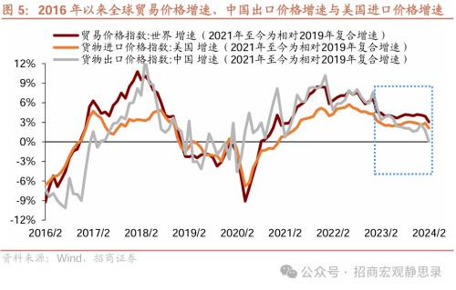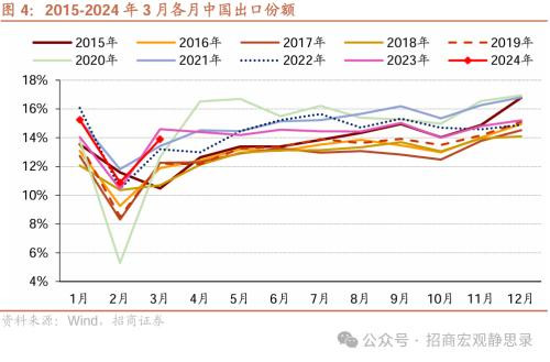 中国名义出口份额从2019年的13%增长到2021年达到15.1%,2023年下降至14.2%。但2021年中国价格因素见顶,随后明显回落,进而我们有理由认为2023年很有可能是中国出口量在全球占比的峰值。换言之,过去四年中国出口量的份额或在逐年提升,而这一变化也得益于海外需求及通胀环境。