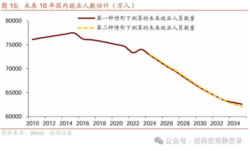 当然,有观点认为未来数年国内退休人口大量增加,就业压力并不大。我们测算两种情形下未来十年国内就业人数:首先假设个体在60岁退休,第一种情形假定个体在18岁后直接进入就业市场,第二种情形假定个体在23岁(即大学毕业后)开始参与就业。如图15,测算结果显示,未来十年就业人口将较目前减少近一亿人,似乎印证了前面的说法。