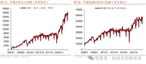 图9中创造就业最多的四大行业均为过去四年的出口受益行业,如图11-12,中国汽车和机械出口金额在疫情之后显著加速攀升。